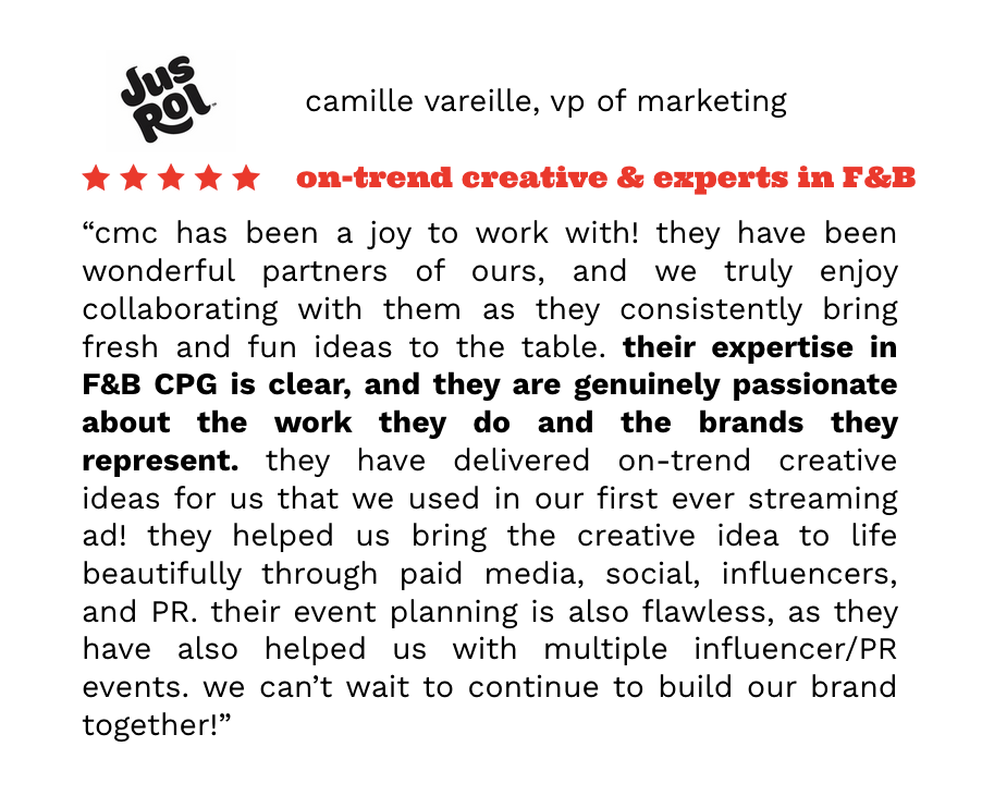 by tying your priorities to what is currently relevant (and crave-worthy!), we ensure your brand is ready for every story, every chat, and every cart that will move the needle for your business.